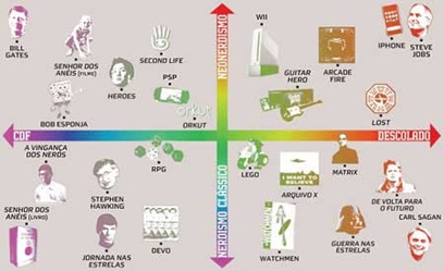 Foi publicado há um certo tempo na revista Super Interessante uma imagem que coloca os tipos de nerds da atualidade. Me lembrou o Guia do Submundo Nerd, criado pela revista Wired. A imagem divide a cultura Nerd em quatro grupos: clássico, descolado, neonerdismo e CDF. Cada grupo tem seus próprios ídolos e cultura um pouco diversificada, apesar de estarem inseridas no mesmo diverso.